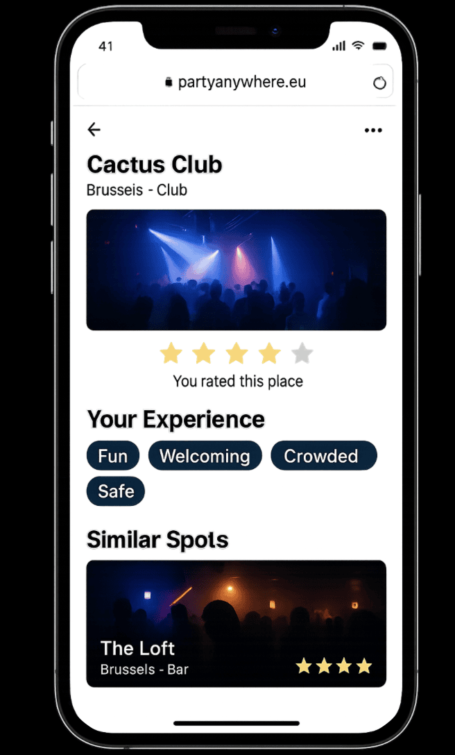 Our filter-based search system helps users discover venues that perfectly match their mood. All filters are derived from anonymous community reviews and are fully transparent to the public. This community wall enables everyone to share real-time warnings and recommendations, creating a trusted and dynamic platform.