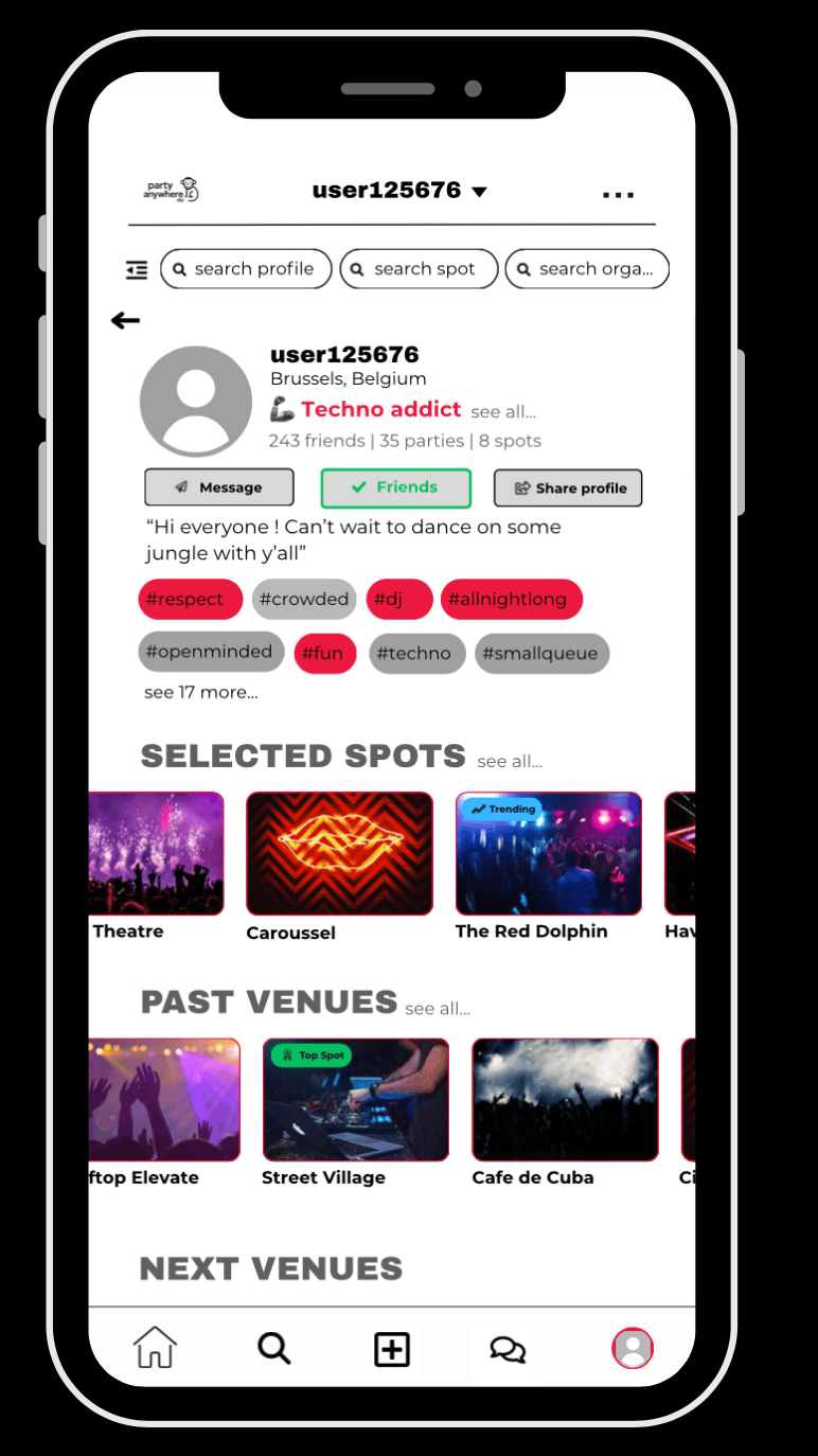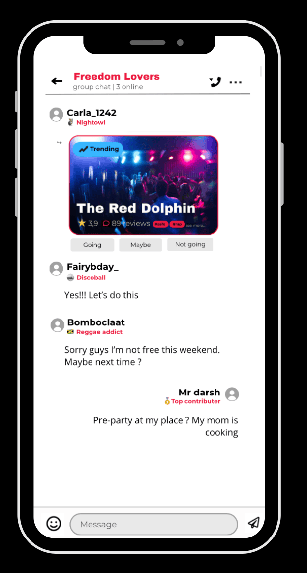 We give you the power to create your own events — from booking a venue to throwing a house party. In just a few taps, set the date, add photos, drop the location, and customise your event page. Share it with your friends or make it public to attract new people. Every event comes with its own dedicated chat channel, so you can coordinate, share updates, and keep the hype alive before, during, and after the party.